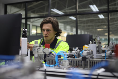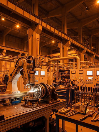 In a state-of-the-art industrial workshop, a technician meticulously adjusts complex machinery. Surrounded by tools, the atmosphere is focused and industrial as dusk approaches.