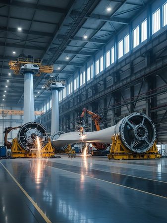 Inside a large industrial factory, robotic arms are assembling wind turbine components, with sparks flying from welding operations on massive blades and rotors.