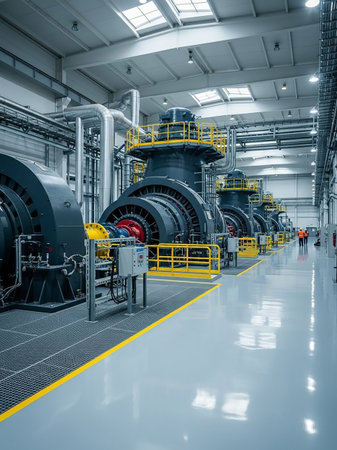 A dynamic scene inside a renewable energy facility, where engineers oversee the transformation of natural forces into sustainable power, the machinery a testament to the industry's role in environmental stewardship.
