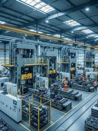 A wide shot of a modern factory floor filled with large industrial machinery, robotic arms, and automated systems.