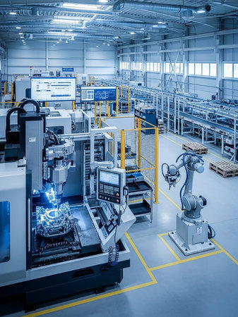 A wide view of a modern, high-tech factory floor illuminated by blue lights, showcasing a robotic arm, CNC machine, and an extensive assembly line.