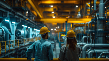 Two engineers in hardhats inspect a maze of pipes and machinery in an industrial setting.