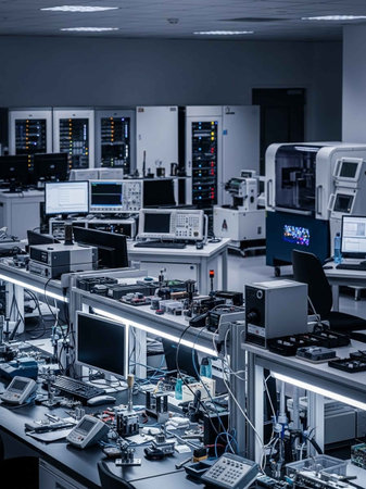 Interior of a modern scientific research and development laboratory. Toned image.