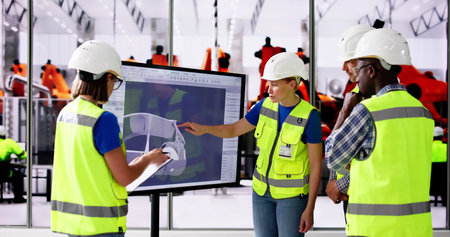 Factory inspectors and supervisors engaging in briefing over production metrics, supporting industrial innovation and sustainable process improvement. Solar power manufacturing. Camera A.