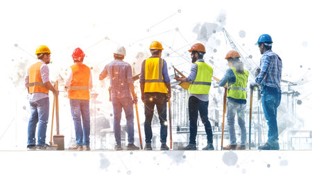 Group of construction workers wearing helmets and vests holding tools. for labor and building themes.
