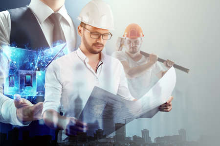 Portrait of a male architect holding a blueprint. The concept of construction, architecture, design. Mixed environment, double exposure