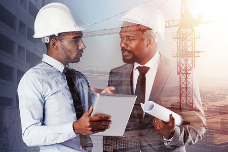 Contractors, worksite overlay and tablet for discussion, city planning and urban development. Architects, collaboration and double exposure of people with internet research and industrial innovation