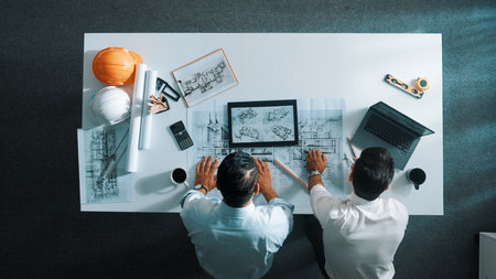 Top down aerial view of smart engineer team using calculator for construction. Professional architect or designer using equipment while manager taking a note and looking at tablet.