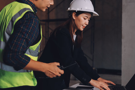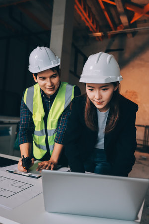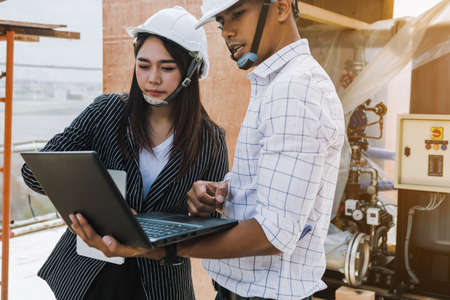 engineers team are discussing while inspecting at construction site, multiracial business engineering man and woman are working outdoors in the urban