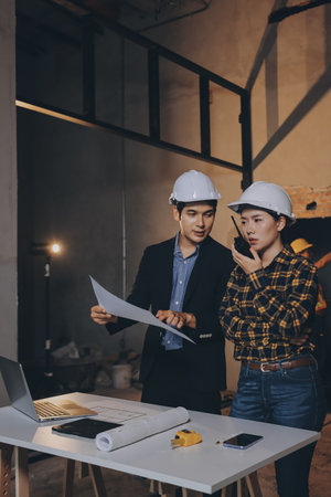 Concept meeting engineers or architects for projects working with partners and engineering tools to create models and blueprints at the job site. construction concept. Engineer concept.