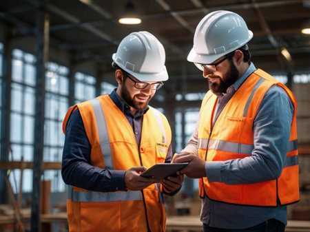 Construction manager and engineer dressed in orange work vests and hard helmets explore construction documentation on the building site near the steel frames