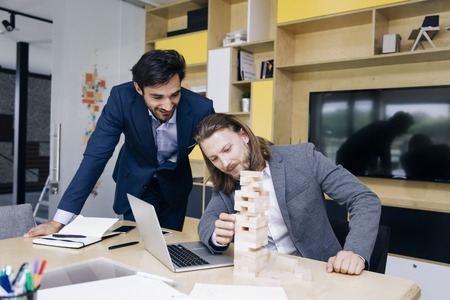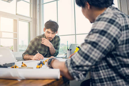 Group engineers discussion and planning about the project to be made on table. Brainstorming of engineers. Construction engineering conceptual. Three architects in office and discussing design project