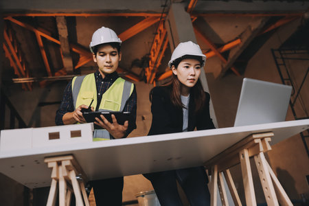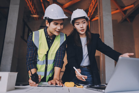 engineers team are discussing while inspecting at construction site, multiracial business engineering man and woman are working outdoors in the urban