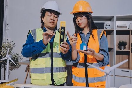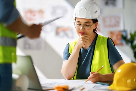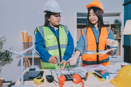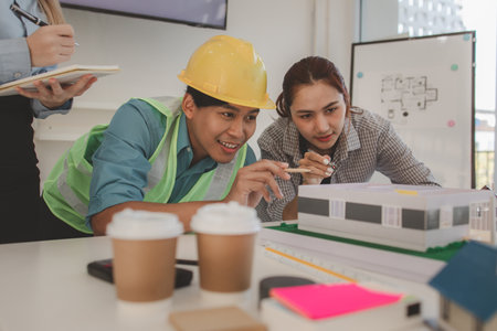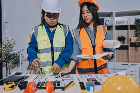 Engineer and architect collaboration in office creative blueprint planning modern environment engaging viewpoint