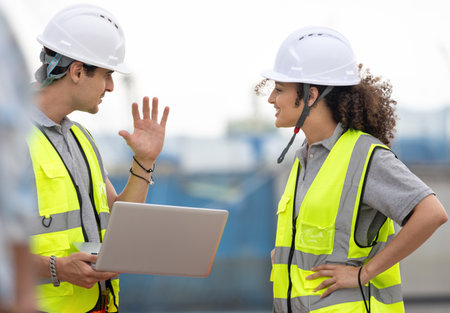 Port Engineers Discussing Logistics at a Shipping Yard, Young Industrial Workers Overseeing Operations at a Commercial Dock, Team of Maritime Professionals Planning at a Harbor