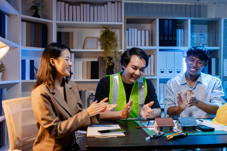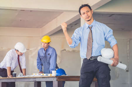 Success business concept. Two asian architects keeping hands up with happy moment.