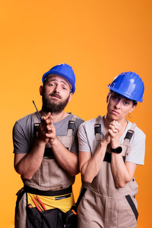 Religious repairman and woman praying to god for good projects, begging for help. Team of engineering experts holding prayer hands to ask for fortune and luck, wearing overalls and helmets.
