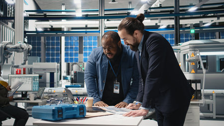 Multiethnic engineers industrial coworkers doing teamwork on production line for solar panels, combining technical insight and teamwork to drive forward clean energy infrastructure. Camera A.