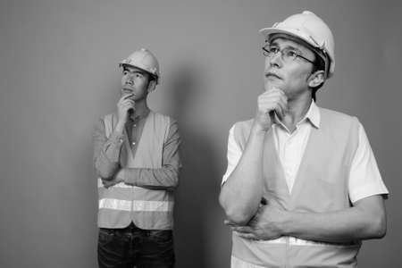 Mature Asian businessman and mature Asian businesswoman holding hardhat together