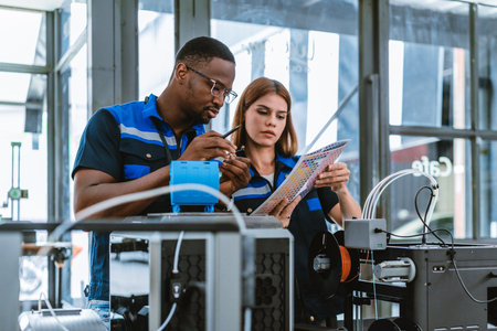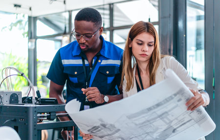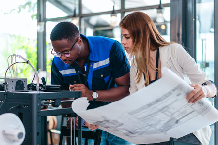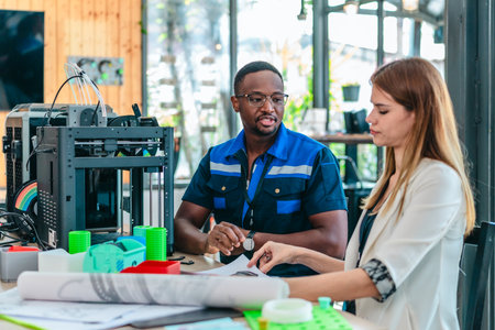 Male engineer collaborates with female product designer, review technical blueprints in design studio. Emphasizing interdisciplinary teamwork, planning, drawings in 3D printing and product development