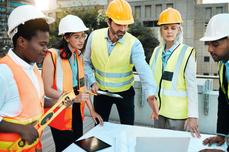 We have a lot to get through. Shot of a diverse group of contractors standing outside together and having a discussion over building plans.