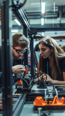 Two individuals are focused on a 3D printer, discussing its components and settings, showing innovation and learning in a high-tech, tool-filled environment.