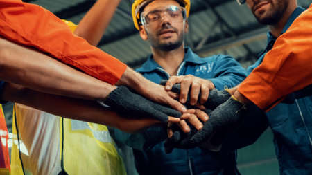 Skillful worker stand together showing teamwork in the factory . Industrial people and manufacturing labor concept .