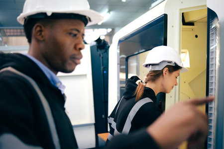 Female engineering manager and mechanic worker doing routine check up in industrial factory