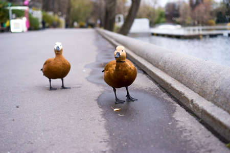 Two ducks on the embankment of the river in the city
