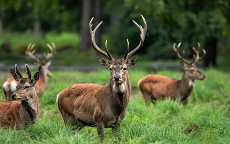 red deer grazing on the meadow in green park.