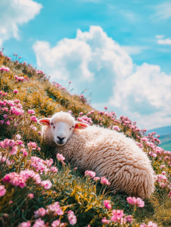 Soft sheep enjoys a peaceful nap on a grassy hill adorned with vibrant flowers, while fluffy clouds float in a cheerful spring sky.