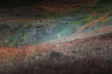 Fox in green landscape. Cute Red Fox. Wildlife scene from nature. Animal in nature habitat. Animal in green environment.