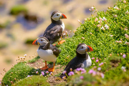 Puffins stand proudly among colorful flowers in a vibrant coastal habitat during summer