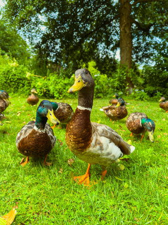 A vibrant group of ducks explores a sunny meadow, showcasing their unique colors and charm, ideal for wildlife and nature enthusiasts passionate about the outdoors