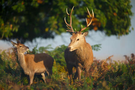 Close-up of a red deer stag with a hind during rutting season in autumn, UK.