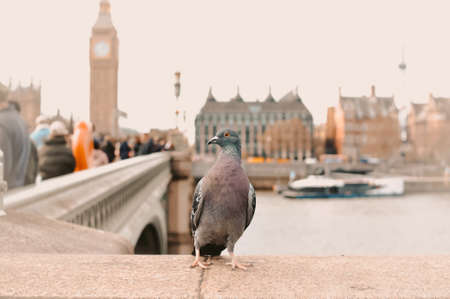 Pigeon walking around London bridge in Great Britain . High quality photo