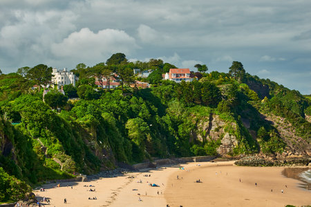 TENBY, WALES, UK - SEPTEMBER 14 2020: People enjoying late summer sunshine on a sandy beach in the picturesque seaside town of Tenby, Wales