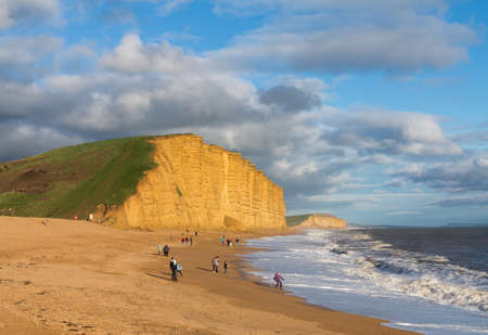 People on beach underneath cliffs and headland at West Bay in Dorset. This was used as the location for the Broadchurch TV series