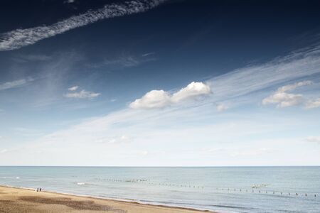 Beach on a bay cover with cliffs by English coast. Horizontal full frame orientation with high horizon and cloudy sky
