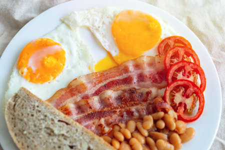 Close up of traditional English breakfast: fried eggs, bacon, beans, toast bread and tomato on a plate.