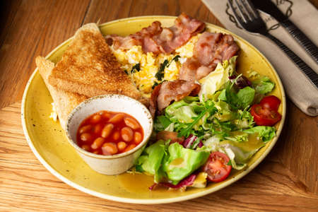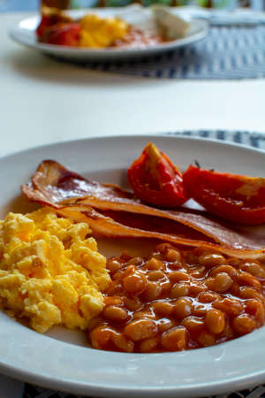 English breakfast with grilled bacon, tomatoes, scrambled eggs and baked beans in tomato sauce served in Spain