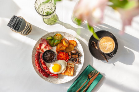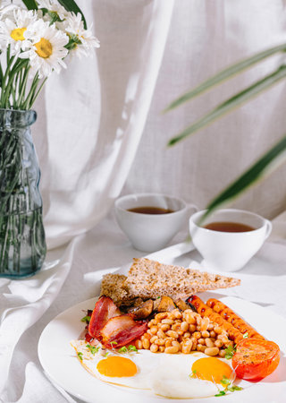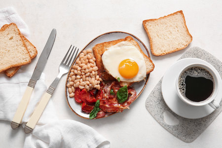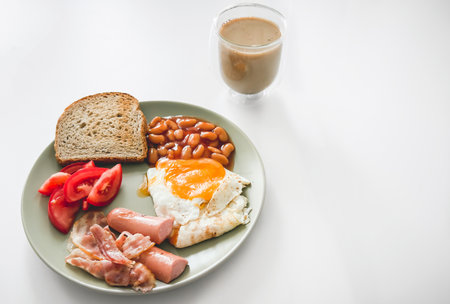 Plate with fried egg, bacon, sausages, beans, tomatoes, and toast served with a cup of coffee on a white table, symbolizing breakfast, energy, and traditional morning meal