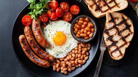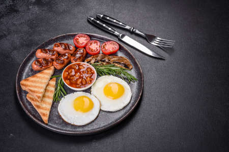 Full english breakfast - bean, fried eggs, roasted sausages, tomatoes, mushrooms on a dark concrete table with toasted bread