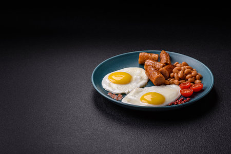 Full English breakfast with boiled eggs, beans, sausages, tomatoes, salt and spices on dark concrete background