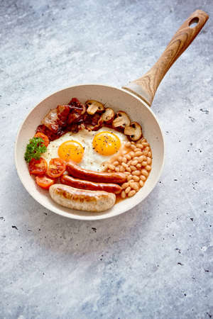 Full English Breakfast served in a pan. Fried eggs, beked beans, tomatoes, champignons, crispy bacon, sausages and toast. Placed on stone background. Top view with copy space.