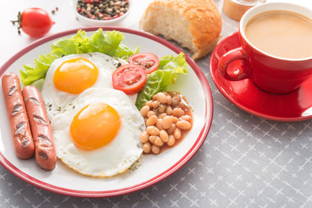 English breakfast with fried egg, beans, tomatoes, sausage, fresh lettuce leaf, coffee cup. Concept of red dishes.