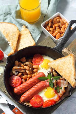 English breakfast in iron cooking pan with fried eggs, sausages, bacon, beaked beans, toasts, orange juice and black coffee on stone background.