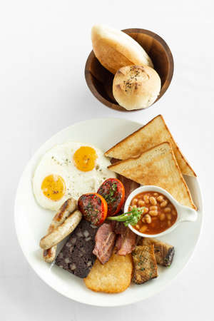 British Full English Breakfast including sausages, grilled tomatoes, mushrooms, eggs, bacon, baked beans and bread. Top view.