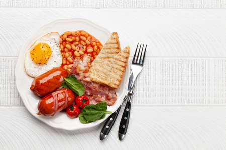 English breakfast with fried eggs, beans, bacon and sausages. Top view flat lay with copy space