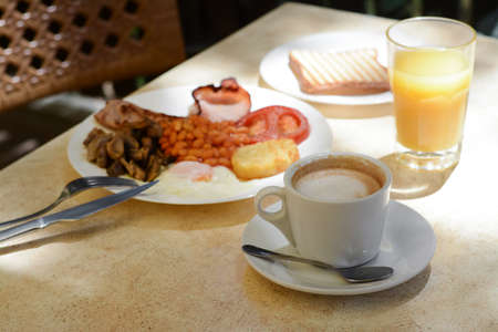 English Breakfast with sausages, eggs, bacon, tomato and orange juice